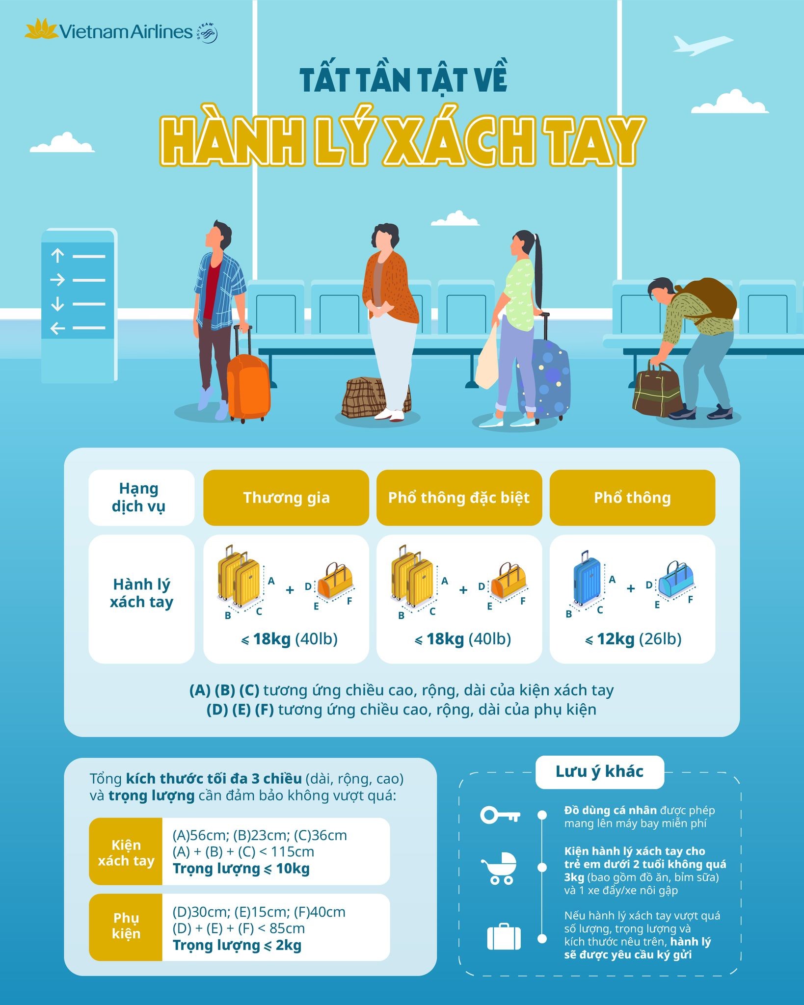 Vietnam Airlines đã thiết lập các quy định chặt chẽ về kích thước và trọng lượng hành lý xách tay nhằm đảm bảo an toàn và sự thuận lợi cho hành khách trong suốt hành trình bay.